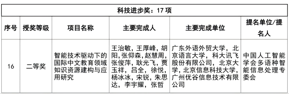 本网讯 近日,中国人工智能学会发布了《2024年度吴文俊人工智能科学技术奖奖励公告》,王治敏教授联合兄弟院校和科技公司,领衔申报的“智能技术驱动下的国际中文教育领域知识资源建构与应用研究”项目荣获吴文俊人工智能科技进步奖二等奖。这一项目是国际中文教育领域首个获得该奖项的成果,标志着人工智能与国际中文教育的深度融合进入新阶段,同时也实现了广外在该国家级人工智能科技奖项上的历史性突破。
